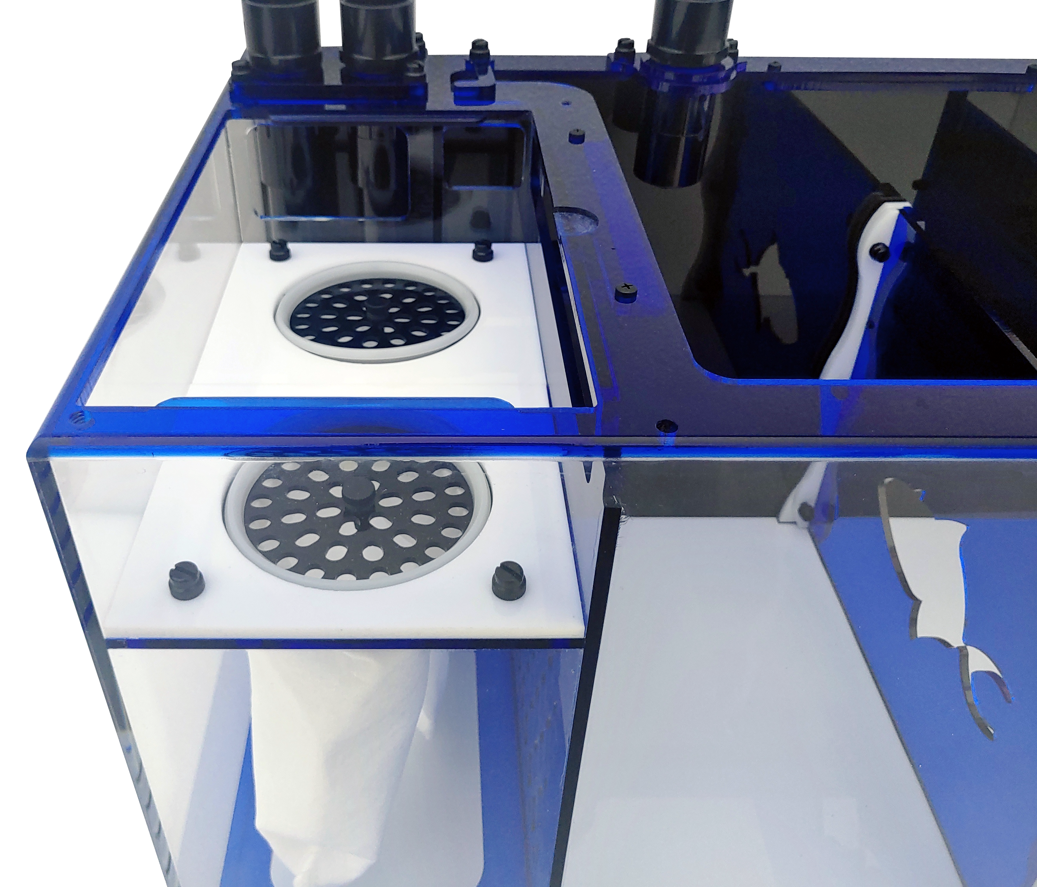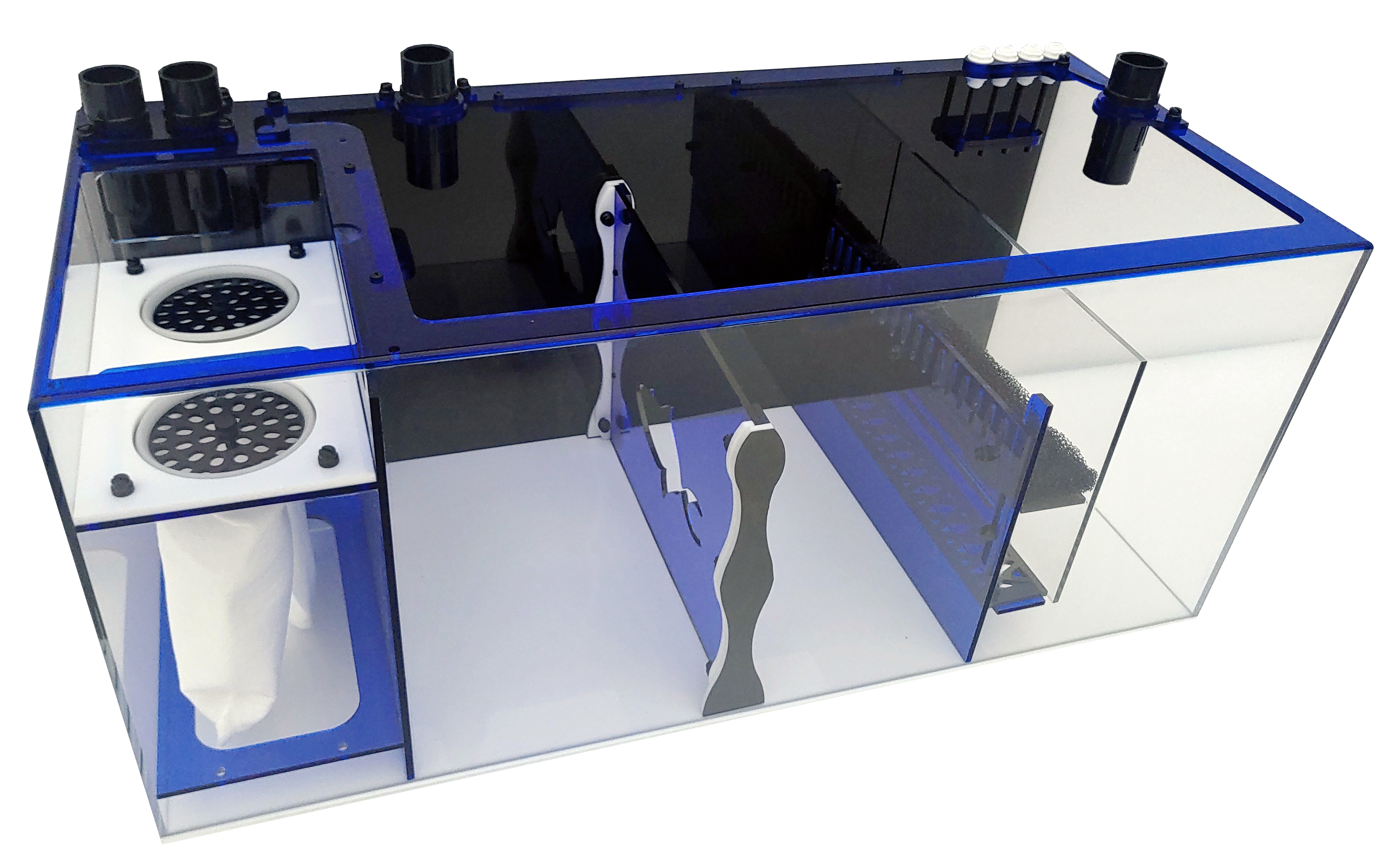 Cosmetically this line will look great in any setup. The bottom is white and the surrounding walls are smoke along with a blue top. The front section has a flush clear polycarbonate lid. All of the plumbing fittings (input from tank, several individual in the middle section, and output to the tank) are all on plates.  All models except for the cube have a middle wall that is move-able to custom size the two sections. This is great for setting the space needed exactly for your protein skimmer maximizing the other section of a refugium or other equipment. The middle wall is also removable to create one large section. The water height is adjustable in the front section of the sump to set the height required by the protein skimmer. There are wire holders strategically placed to hold the wires and hoses, keeping them in place for a clean look.