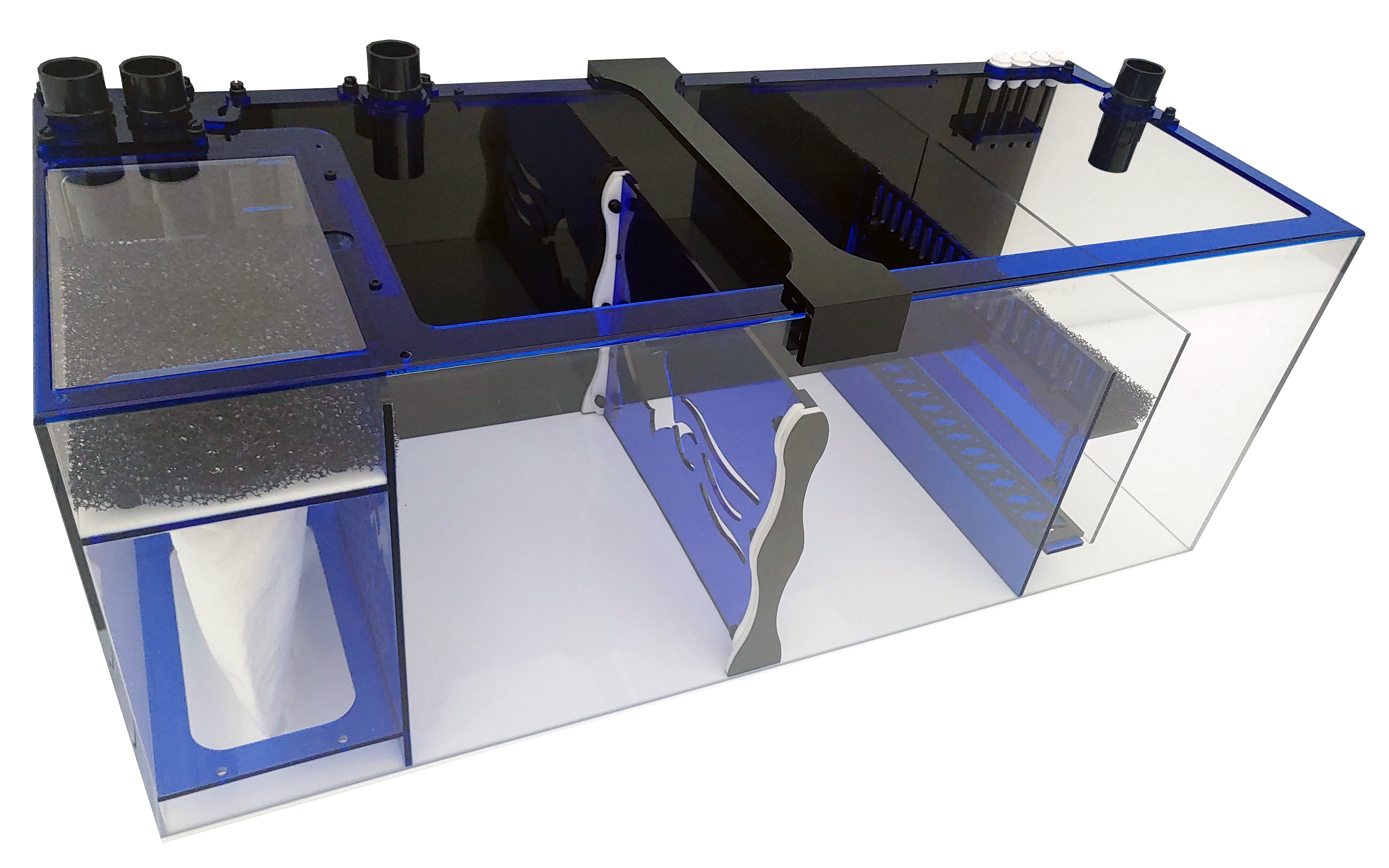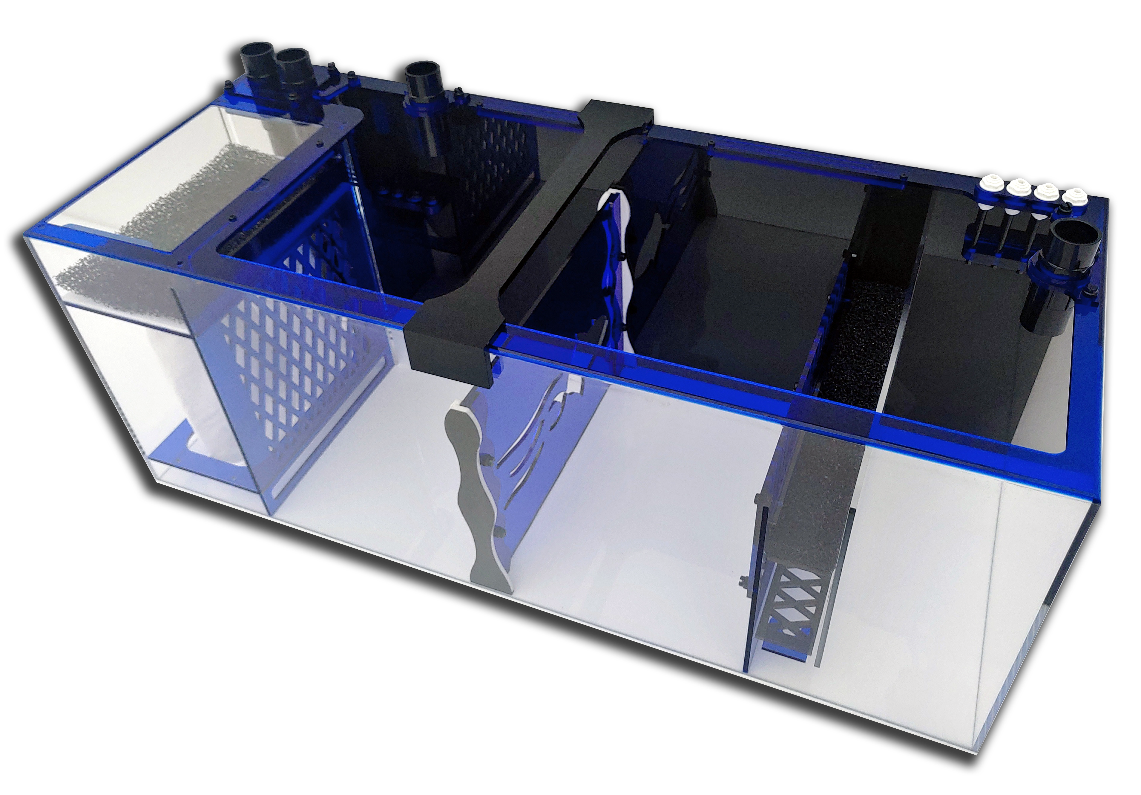 Cosmetically this line will look great in any setup. The bottom is white and the surrounding walls are smoke along with a blue top. The front section has a flush clear polycarbonate lid. All of the plumbing fittings (input from tank, several individual in the middle section, and output to the tank) are all on plates.  All models except for the cube have a middle wall that is move-able to custom size the two sections. This is great for setting the space needed exactly for your protein skimmer maximizing the other section of a refugium or other equipment. The middle wall is also removable to create one large section. The water height is adjustable in the front section of the sump to set the height required by the protein skimmer. There are wire holders strategically placed to hold the wires and hoses, keeping them in place for a clean look.