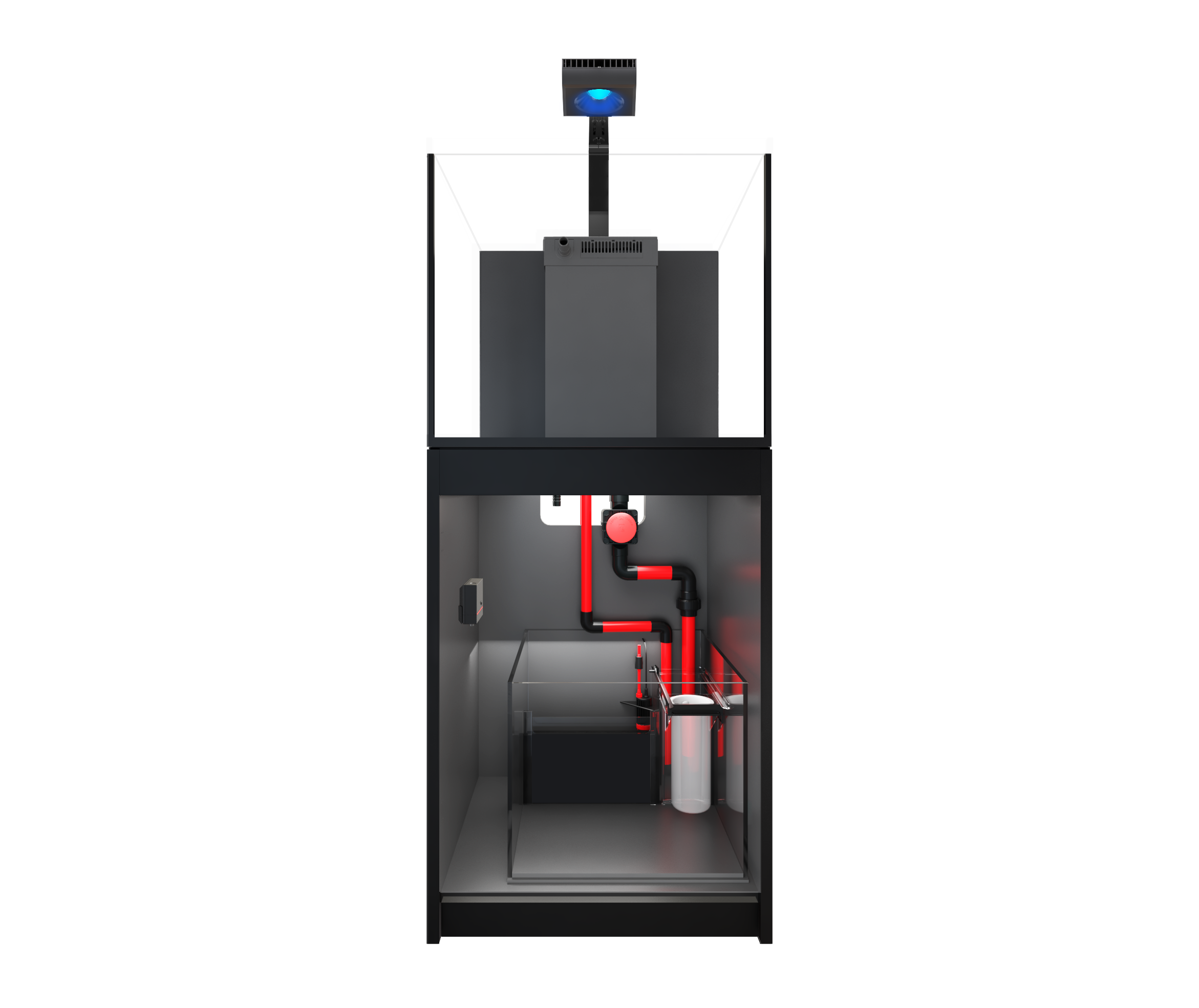 The professional sump includes a removable mechanical filtration media compartment (with micron filters & filter cups), an optional refugium compartment, an adjustable height skimmer chamber for optimal skimmer performance, and a bubble trap to prevent air bubbles from returning to the aquarium.